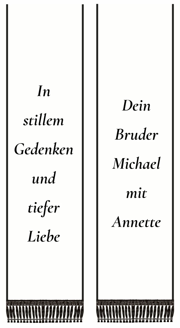 Die schmale Bordüre verleiht der Schleife eine dezente Struktur und unterstreicht die hochwertige Verarbeitung, ohne vom eigentlichen Ausdruck der Trauer abzulenken. Ob für Kränze, Gestecke oder Sargauflagen – diese Trauerschleife ergänzt florale Arrangements harmonisch und stilvoll.